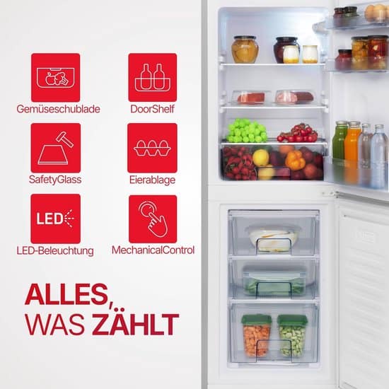 - Klassieke constructie met dubbele deur voor een duidelijke organisatie: de koelvriescombinatie biedt een totale capaciteit van 138 liter met 93 liter koelruimte en 45 liter vriesgedeelte. De gescheiden koel- en vrieszones ondersteunen een overzichtelijke opslag in het dagelijks leven en maken het apparaat tot een functionele koel-vrijstaande oplossing voor kleinere huishoudens.