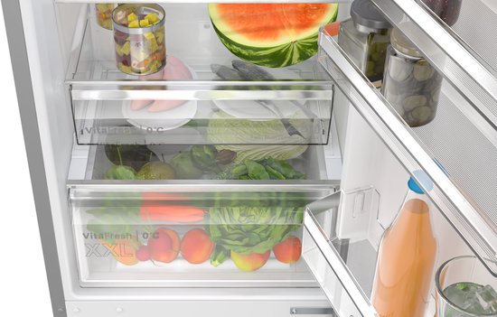 Bosch Serie 4 KGN392LAG. Totale nettocapaciteit: 363 l. Deurscharnieren: Rechts. Klimaatklasse: SN-T, Geluidsniveau: 29 dB. Nettocapaciteit koelkast: 260 l, No Frost (koelkast), Multi-luchtwegsysteem (koelkast), Koelkast binnenverlichting. Nettocapaciteit vriezer: 103 l, Vriescapaciteit: 10 kg/24u, No Frost (vriezer). Vers zone compartiment. Energie-efficiëntieklasse: A, Jaarlijks energieverbruik: 112 kWu. Kleur van het product: Metallic