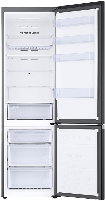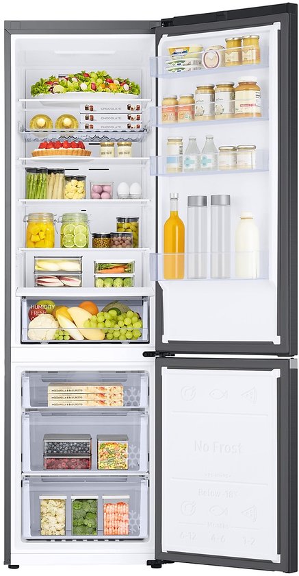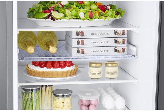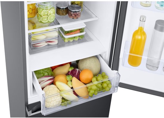 Samsung RL38C602CB1. Totale nettocapaciteit: 390 l. Deurscharnieren: Rechts. Klimaatklasse: ST-T, Geluidsniveau: 35 dB. Nettocapaciteit koelkast: 276 l, No Frost (koelkast), Koelkast binnenverlichting, Aantal planken koelkast: 5. Nettocapaciteit vriezer: 114 l, Vriescapaciteit: 8 kg/24u, No Frost (vriezer). Vers zone compartiment. Energie-efficiëntieklasse: C, Jaarlijks energieverbruik: 169 kWu. Kleur van het product: Zwart, Roestvrijstaal