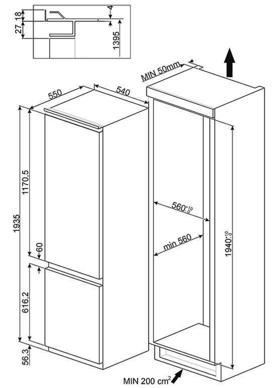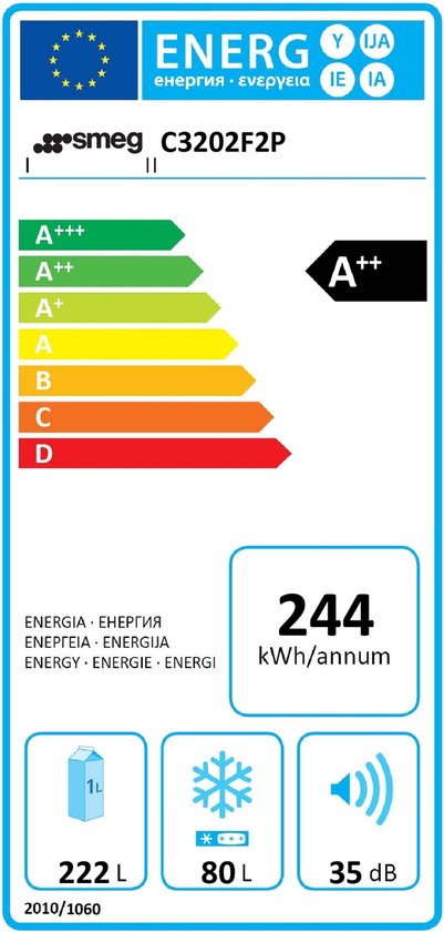 Smeg C3202F2P. Deurscharnieren: Rechts, Type beeldscherm: LED. Klimaatklasse: SN-T, Geluidsniveau: 35 dB. Nettocapaciteit koelkast: 222 l, Koelkast binnenverlichting, Aantal planken koelkast: 4, Aantal groente lades: 1. Nettocapaciteit vriezer: 80 l, Vriescapaciteit: 3 kg/24u. Jaarlijks energieverbruik: 244 kWu